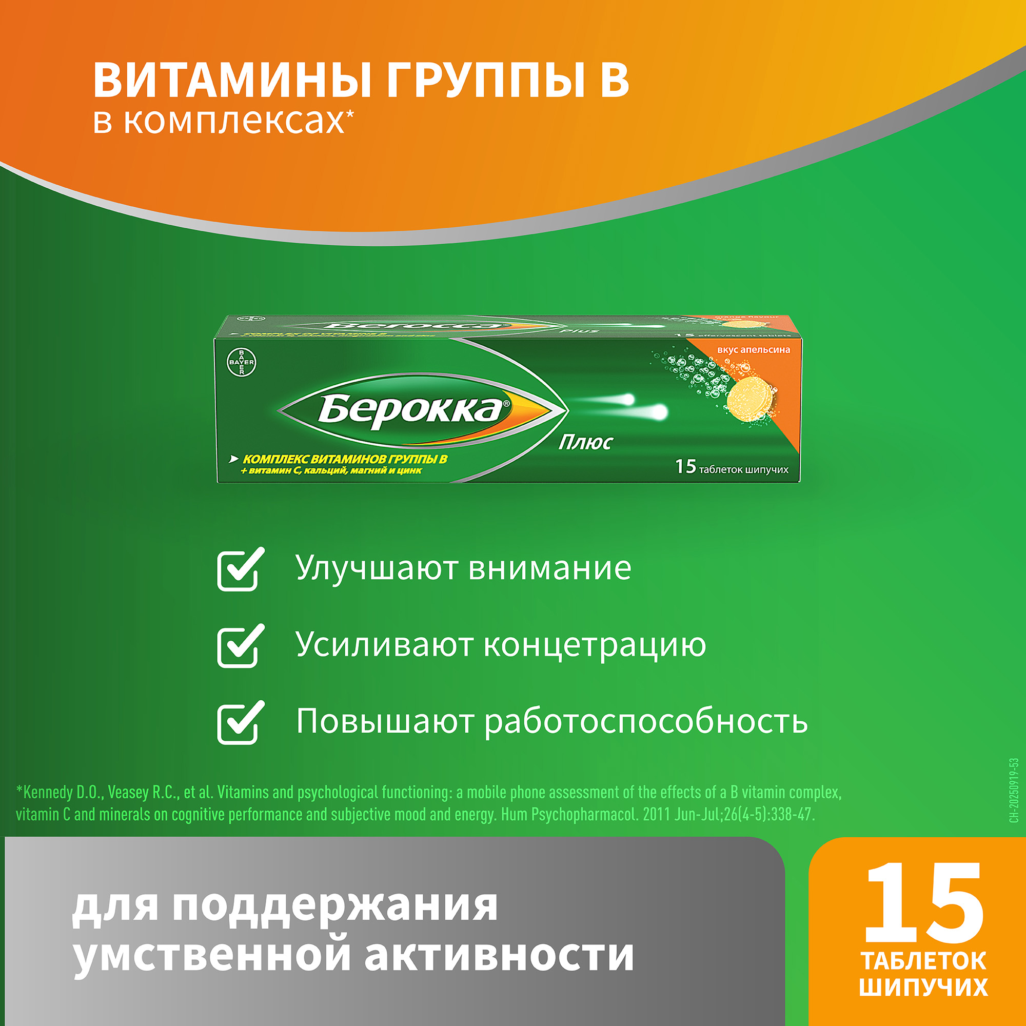 ХарактеристикаФармакологические действияПоказанияПрепарат Берокка® Плюс применяется у взрослых и детей старше 15 лет по показаниям: дефицит или состояния, сопровождающиеся повышенной потребностью в витаминах группы В, витамина С, а также, кальция, магния и цинка.ПротивопоказанияНе применяйте препарат Берокка® Плюс если у Вас есть любое из перечисленных ниже состояний или заболеваний: гиперчувствительность к действующим веществам или к любому из вспомогательных веществ, перечисленных в разделе 6, гиперкальциемия, гипермагниемия, мочекаменная болезнь (нефролитиаз, уролитиаз), гемохроматоз, гипероксалурия, нарушение функции почек, дефицит глюкозо-6-фосфатдегидрогеназы, непереноси мость фруктозы, детский возраст до 15 лет.Применение при беременности и кормлении грудьюЕсли Вы беременны или кормите грудью, думаете, что забеременели, или планируете беременность, перед началом приема препарата проконсультируйтесь с лечащим врачом или работником аптеки